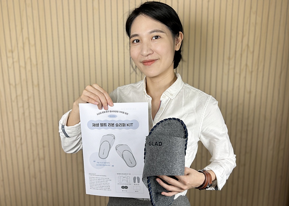 ▲직접 개발한 재생 펠트 리본 슬리퍼 제작 키트를 들고 있는 의식주의 윤태이 대표 ⓒ(주)의식주의 |