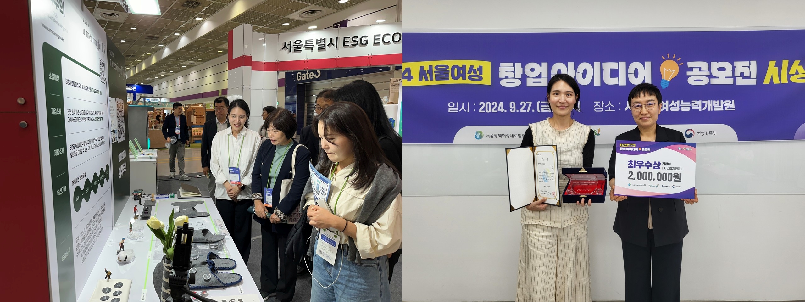 ▲서울시 공정경제과에서 의식주의 제품을 보고 있는 모습(좌)과 서울여성창업아이디어공모전에서 수상한 모습(우) ⓒ(주)의식주의 |